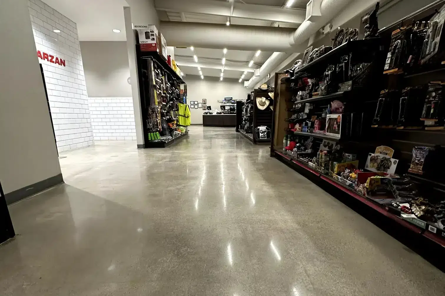 High-gloss concrete floors improve ambient lighting and can reduce energy consumption in large facilities such as warehouses and showrooms.
