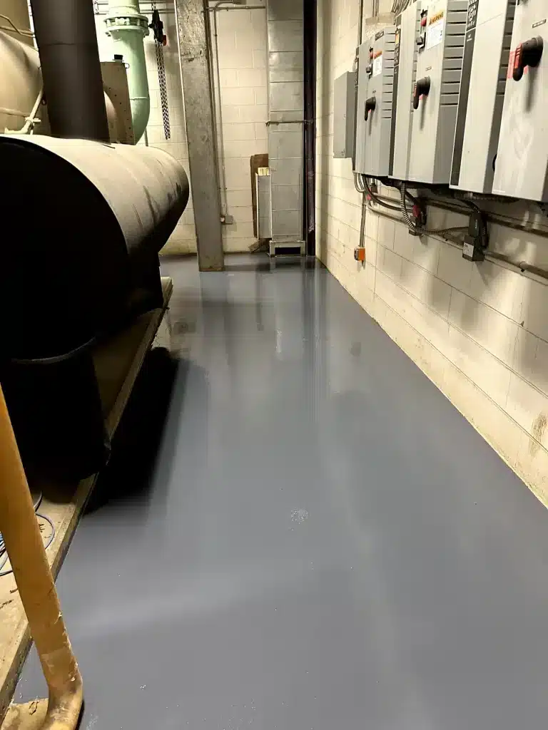 - Chemical Resistance: In mechanical rooms where exposure to oils, cleaners, and chemicals is common, epoxy’s resistance ensures that spills won’t damage the flooring or create safety hazards.